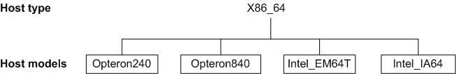 The following example has a host type of X86_64. Host models are Opteron240, Opteron840, Intel_EM64T, Intel_IA64.